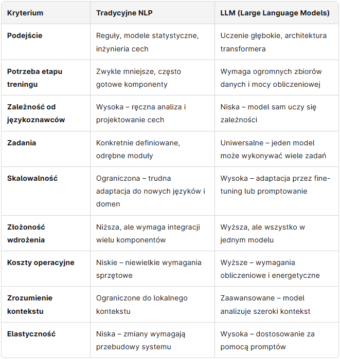 Tabela porównawcza - NLP vs LLM