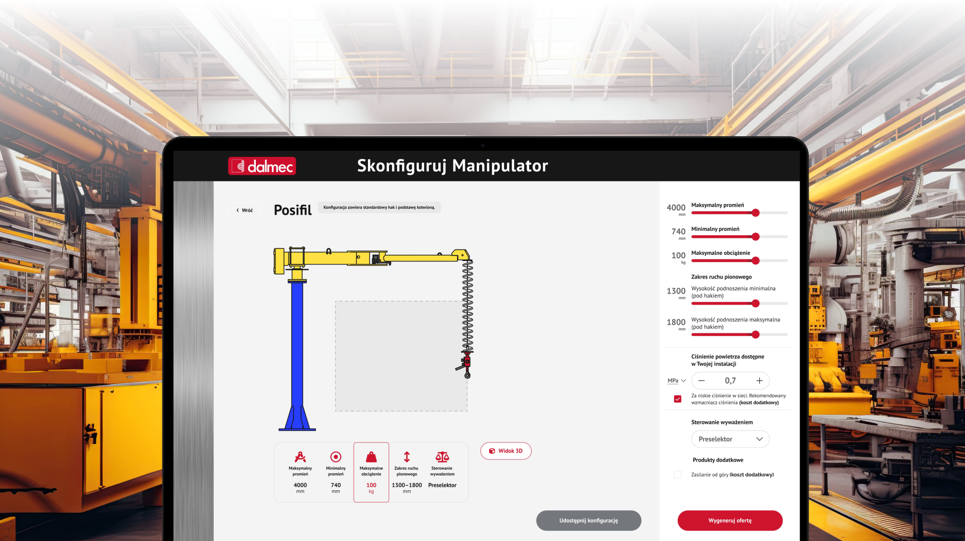 Naszym głównym celem było zaprojektowanie i wdrożenie nowoczesnego narzędzia konfiguracyjnego, które nie tylko uprości proces ofertowania manipulatorów przemysłowych, ale również pozwoli firmie Dalmec wyróżnić się na tle konkurencji jako innowacyjny dostawca rozwiązań szytych na miarę.